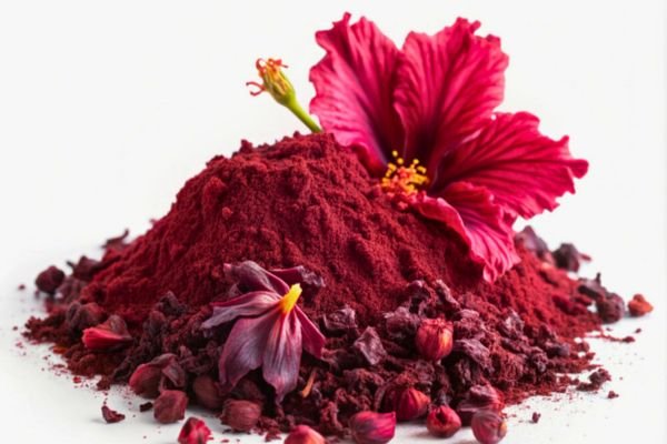 Natural hibiscus powder used in herbal teas, cosmetics, and health products.